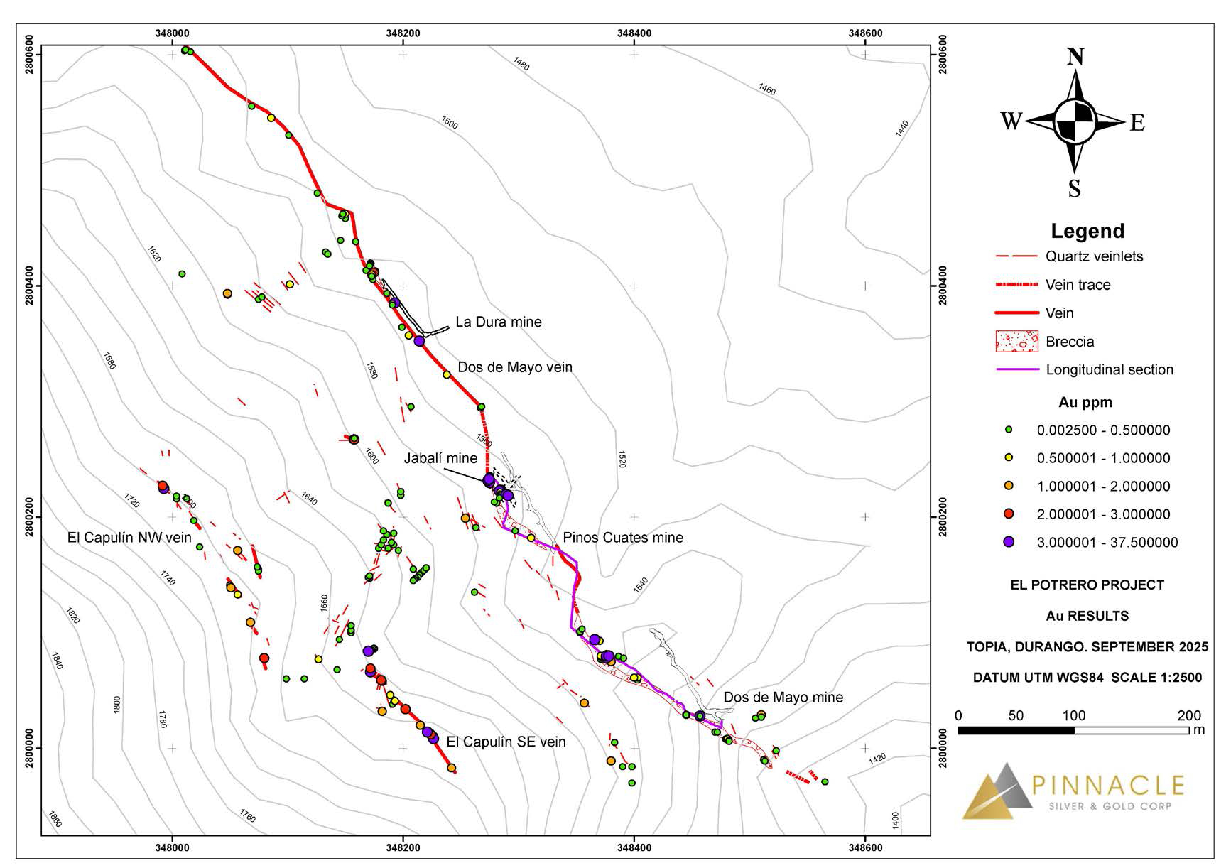 “We are extremely pleased with how the combination of underground and surface sampling is coming together to define a strong, well-defined and high-grade vein system at El Potrero,” stated Robert Archer, Pinnacle’s President & CEO. “On the Dos de Mayo trend, the higher silver grades at surface continue to suggest there may be some vertical zonation, with silver increasing upwards. As one moves uphill to El Capulin, the continued presence of gold-silver mineralization up to 1720 masl infers that mineralization here could extend downwards to similar levels seen on the Dos de Mayo structure, or a vertical distance of approximately 200 metres. These observations are consistent with low sulphidation systems in the Topia District and elsewhere in Mexico and bode well for the potential to develop significant zones of mineralization.”